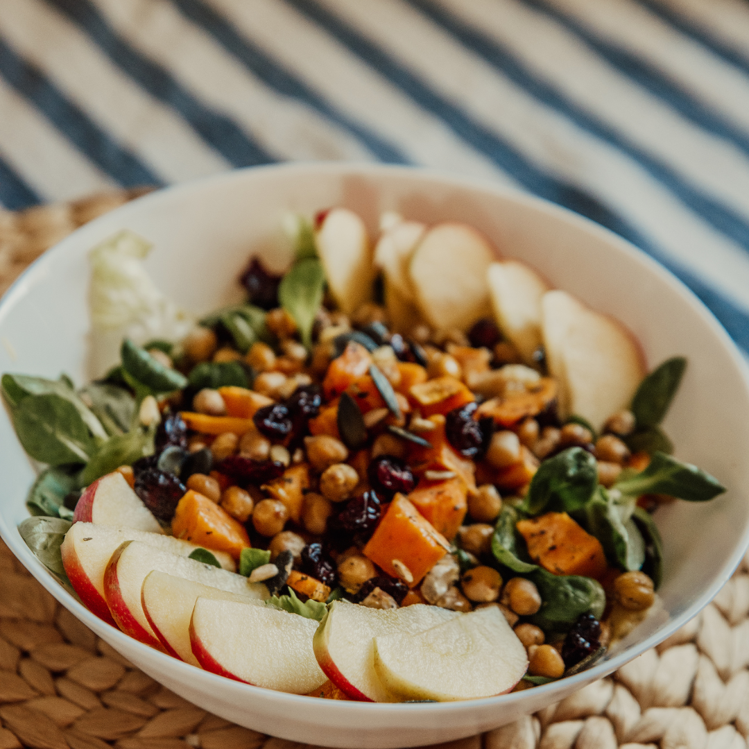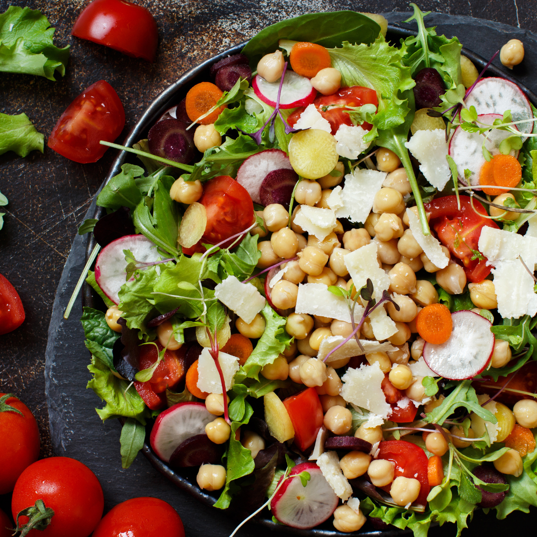 병아리콩을 주 재료로 한 훔무스는 중동 요리의 핵심입니다. 병아리콩을 부드럽게 갈아서 올리브 오일, 레몬즙, 타히니, 마늘을 추가하여 만듭니다. 이 훔무스를 베지터블 스틱이나 크래커와 함께 제공하면 완벽한 건강 간식이 됩니다. - 샐러드: